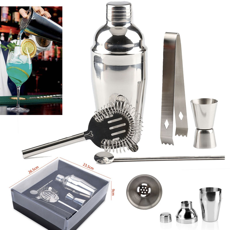 This cocktail shaker set is made of stainless steel. 5 piece barware tool set is perfect for mixing drinks and craft cocktails. This includes 550ml martini shaker with strainer and leak proof lid top, dual jigger shot glass, drink stirrer spoon and mini ice tongs. This portable and cool bar tools in elegant design can be easily cleaned in dishwasher.