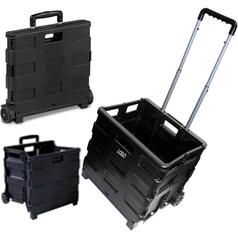 Folding cart is made of heavy duty plastic and aluminum. With two smooth rolling rubber tires, retractable handle, foldable cart and two rubber wheels, it is durable and convenient enough for you to take just everywhere you might need. This multi-purpose cart is quickly collapsed and easily open for transporting various items. Custom logo can be imprinted with all colors.